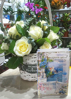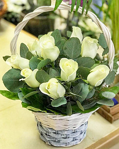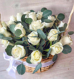 Стильная корзина из 11 нежно-белых роз будет превосходным подарком для любого человека, особенно цветам обрадуется женщина. Букет уместен на свадьбе или на другом важном торжестве. Также его дарят возлюбленным, так как белые розы отлично передают нежность и чистоту человека, отношений и намерений. Стильное украшение цветочной композиции, где к розам добавлены эвкалипт и салал, убедят получателя в вашем непревзойденном вкусе. Легкий запах придется по вкусу дорогому человеку.