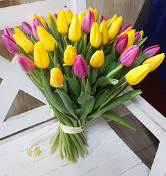 Букет из множества ярких тюльпанов – прекрасный способ выразить своё расположение и подарить шикарное настроение возлюбленной, близким друзьям или коллеге по работе. Цветы подойдут для праздника, извинения или просто в виде приятного ненавязчивого жеста, дарящего приподнятое настроение. Фиолетовый цвет покажет уважение и преданность, а желтый принесет лучики солнца в жизнь близкого человека.